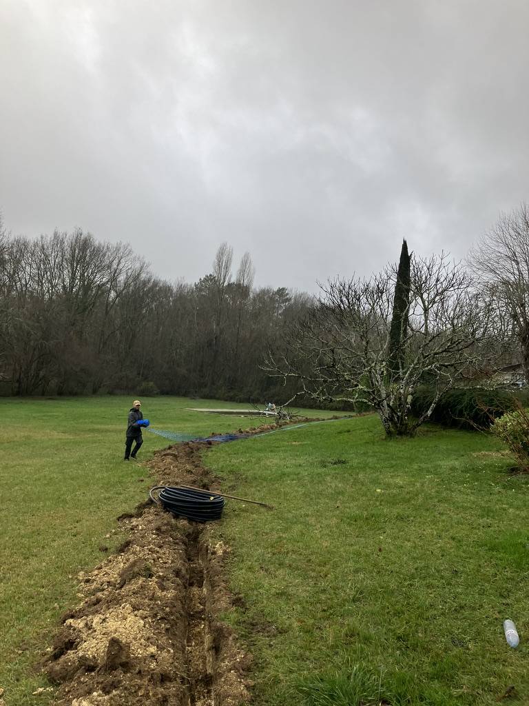 mini pelle mécanique… Une fois ceci fait nous tirons une nouvelle canalisation en polyéthylène. Il ne nous reste plus qu'à raccorder le compteur à l'arrivée principale de la maison.